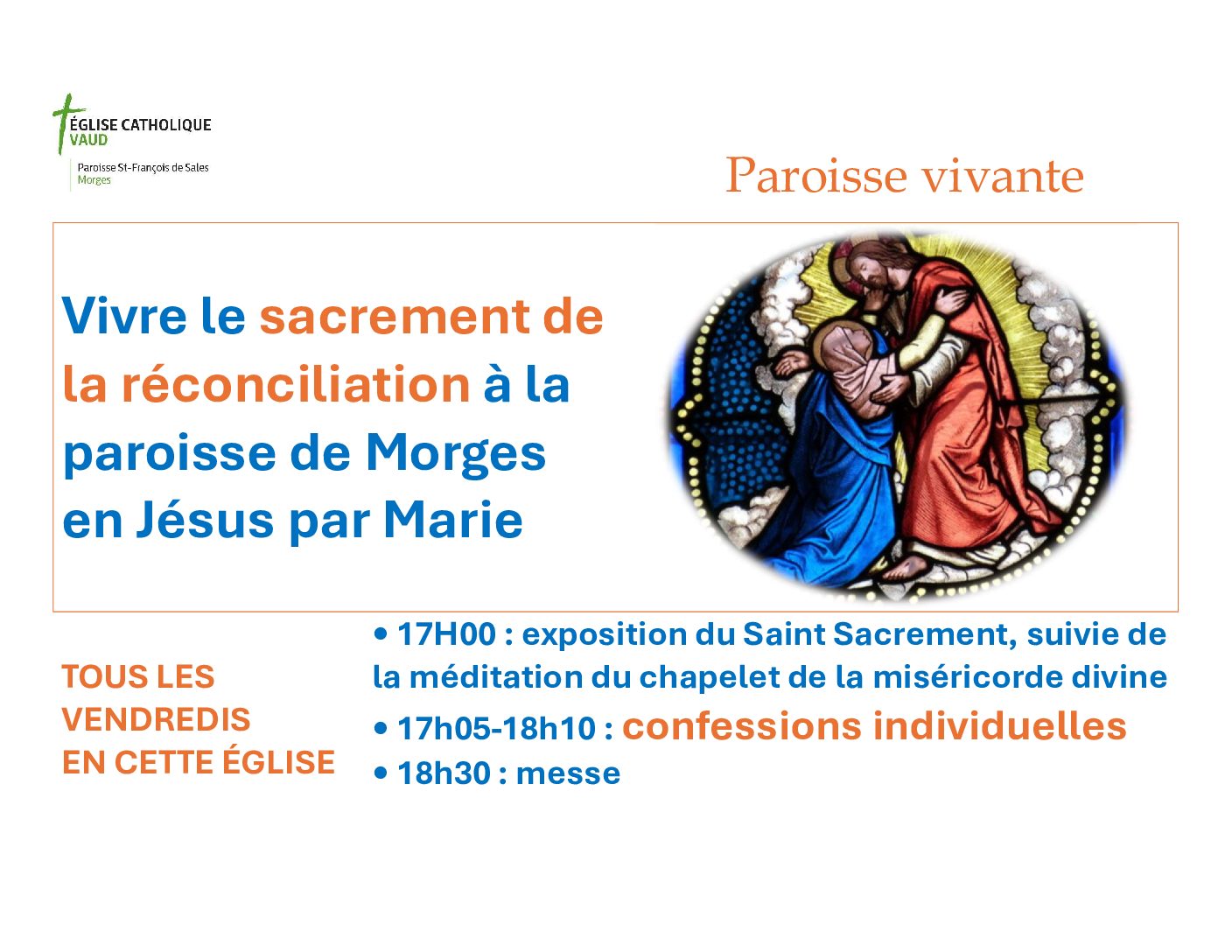 Les confessions individuelles ont lieu chaque vendredi à l'église Saint François de Sales à Morges, entre 17h00 et 18h00.