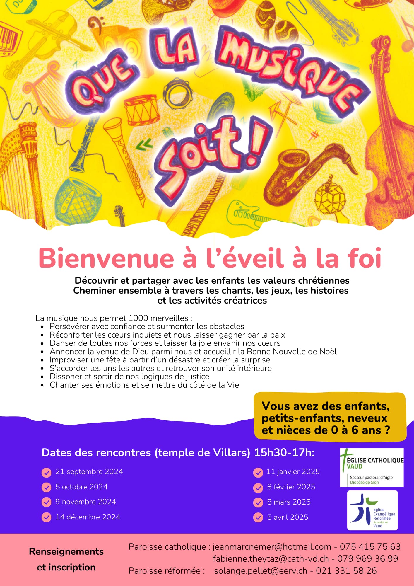 En guise de partition d'accompagnement, des textes bibliques nous feront découvrir des univers musicaux variés et favoriseront de belles rencontres, avec une narration biblique accompagnée d’un espace de chant, de prière et d’un goûter.